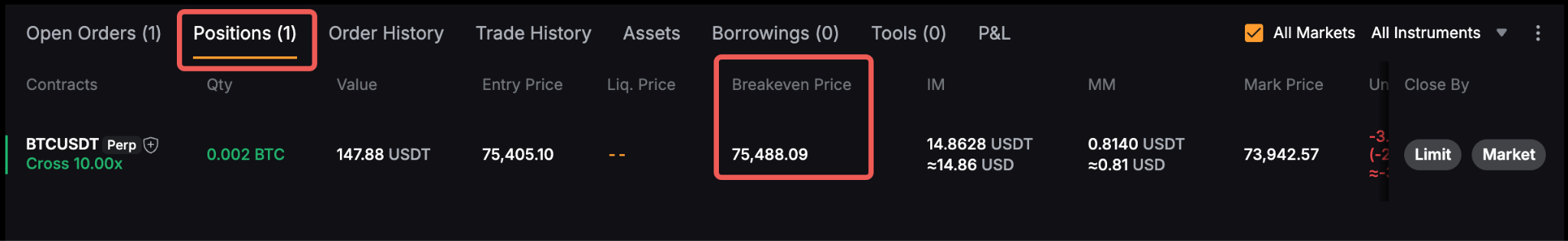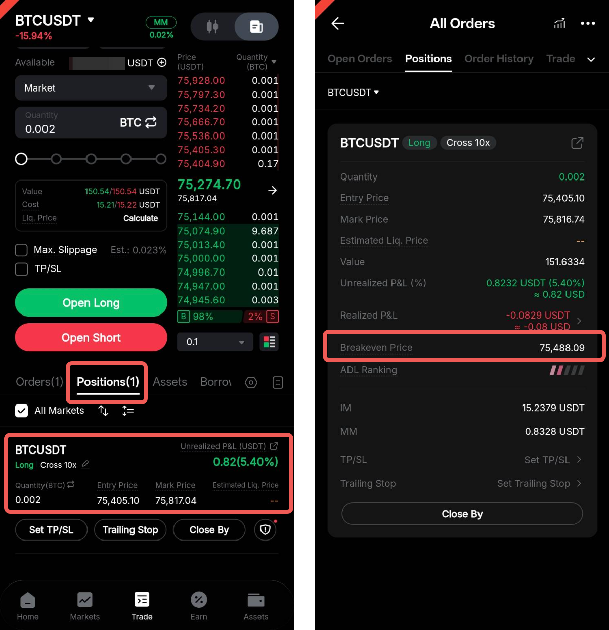 未结仓位盈亏(不含手续费) = 0.1 x (75,000 − 70,000) = 500 USDT