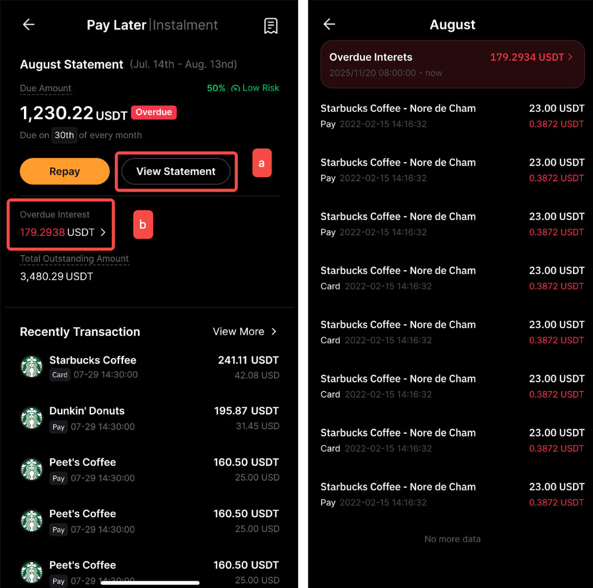 点击“Bybit 先买后付”页面上的分期付款 → (a) 查看对账单或 (b) 逾期利息,您可以看到逾期利息和每项明细。