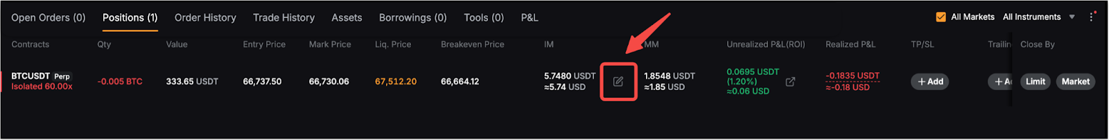 在网站上,前往仓位标签页,然后点击交易页面底部的调整图标 旁边的IM.