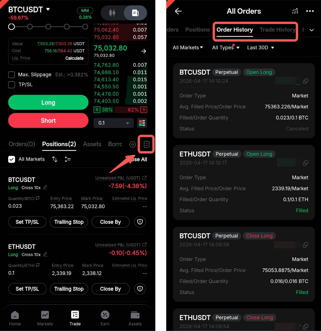 在 Bybit App 上,点击订单簿下方的 历史记录图标 以查看您的 订单记录 和 交易历史。
