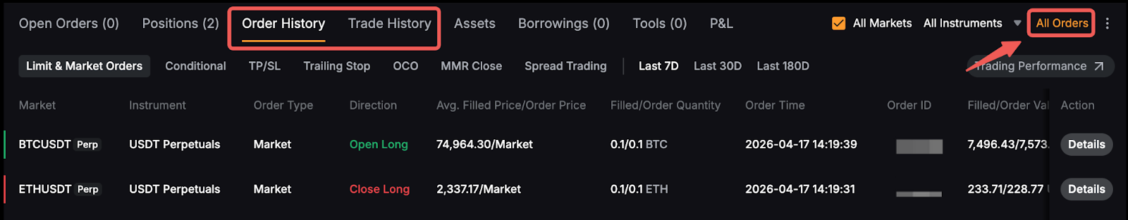 在网站上,您可以在 K 线图下方的 订单记录和 交易记录部分查看您的交易记录。点击 所有订单以查看完整记录。