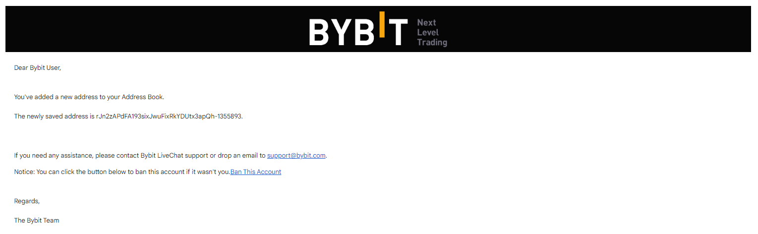 Bybit 的反网络钓鱼代码是一种个性化的安全功能,由字母、数字和符号的独特组合组成。启用后,此代码将出现在来自 Bybit 的所有官方电子邮件和文本消息中,以便您轻松验证所接收信息的真实性。