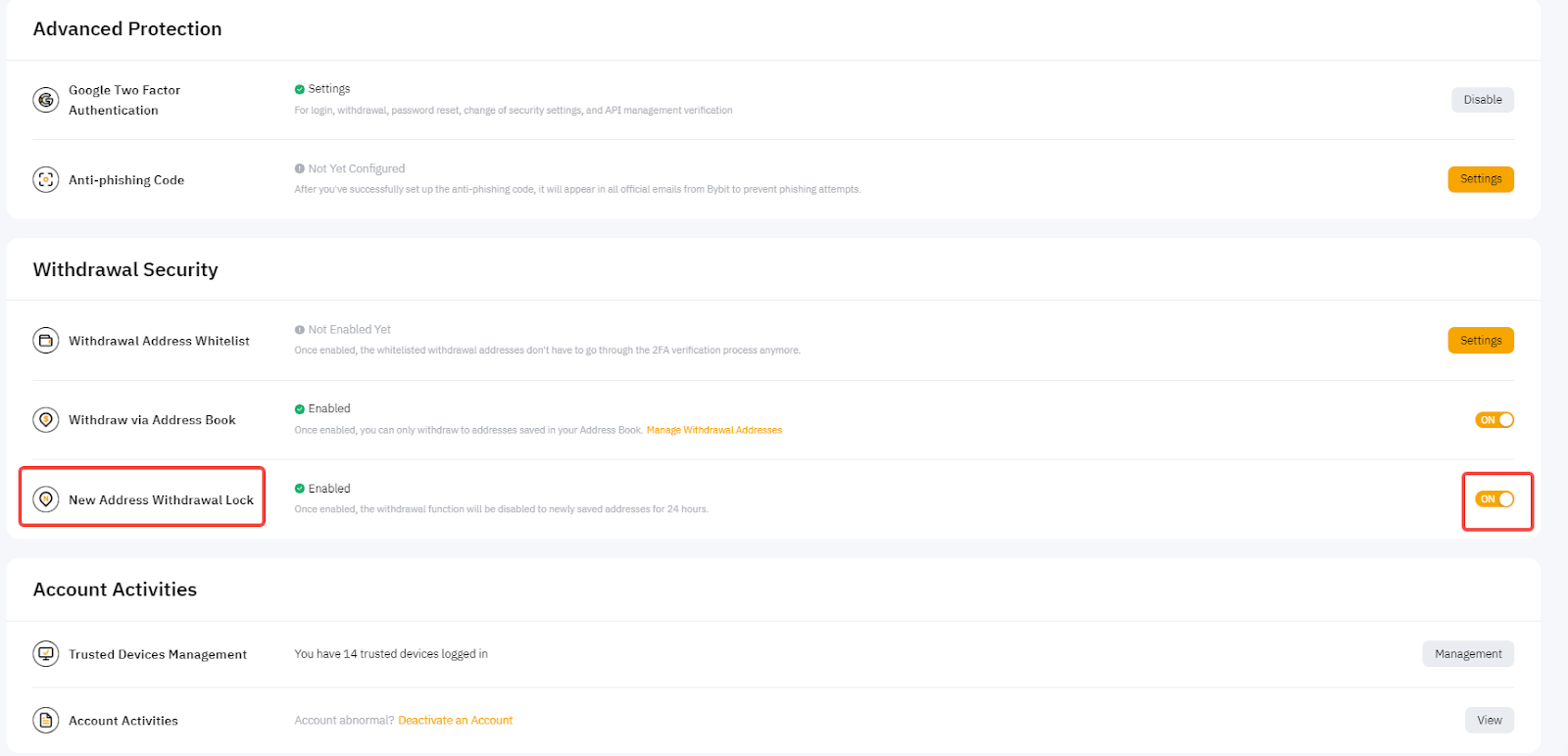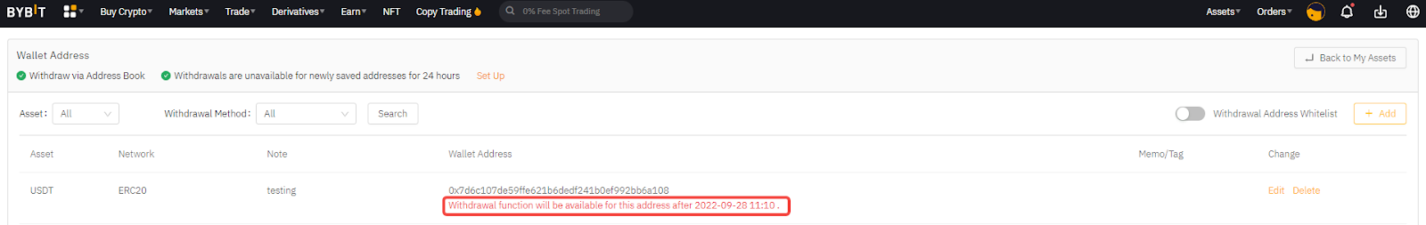 启用新地址提现锁定功能会限制任何新添加的提款地址在 24 小时内使用。这提供了额外的安全层,并有助于防止未经授权的提现。请访问此处管理您的提款安全。