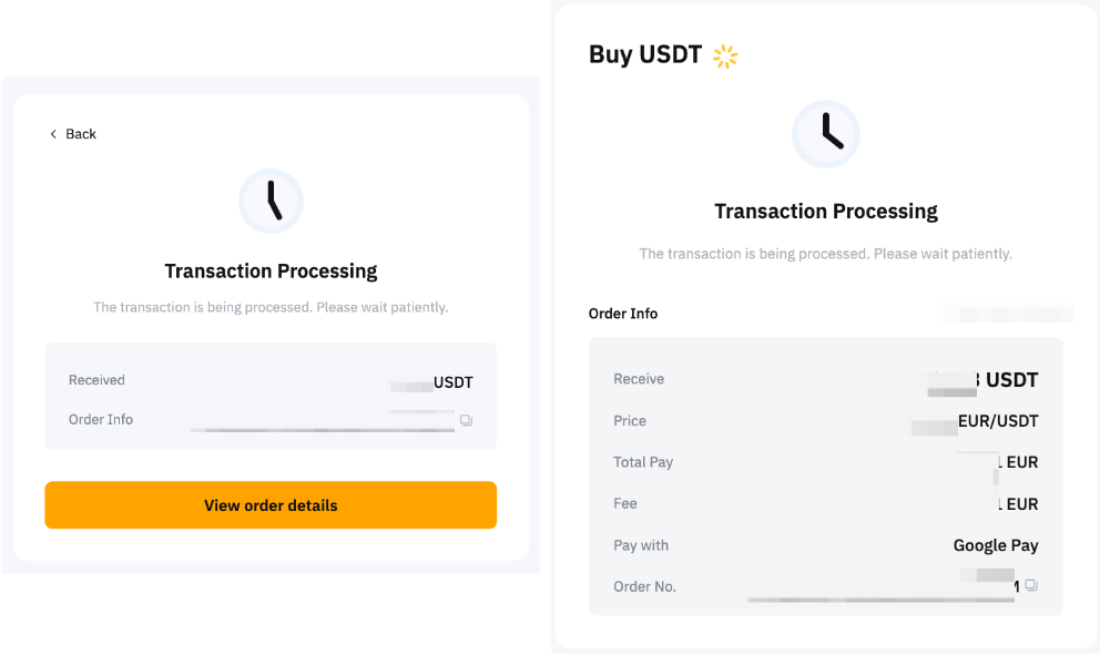 您可以点击快捷买币页面上的历史图标,在快捷买币记录页面上追踪充值情况。