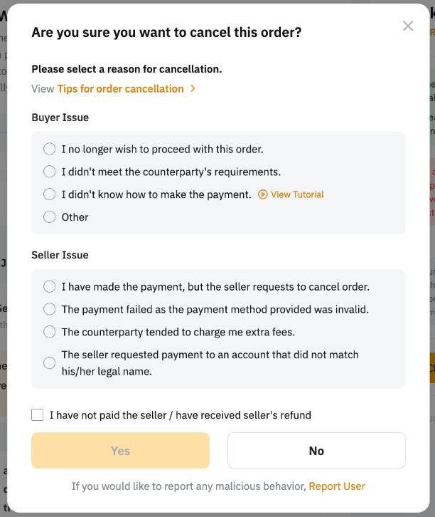 如果您坚信取消是由于卖方的过错造成的,请点击请求审查并提供支持您申诉的有效证明,提交上诉。P2P 专员将在 1-2 个工作日内协助您的请求。