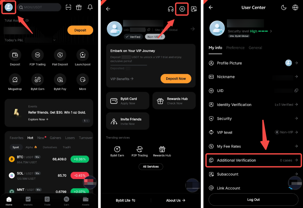 登录 Bybit App,然后前往个人资料图标 → 设置 → 附加验证。
