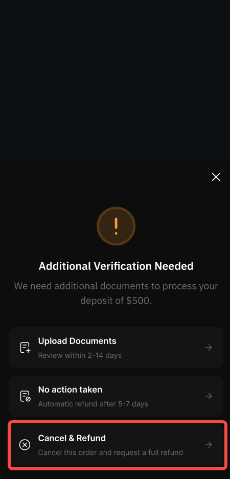 第 4 步:您的取消验证获得批准后,您将收到电子邮件和推送通知。资金通常会立即到账。但在极少数情况下,该过程最多可能需要 12 小时。