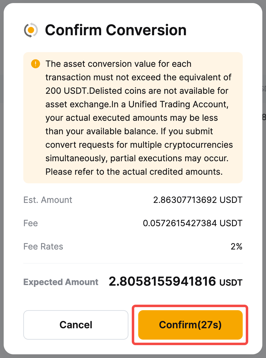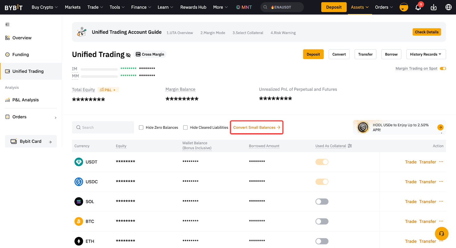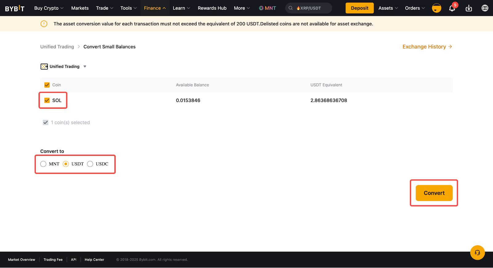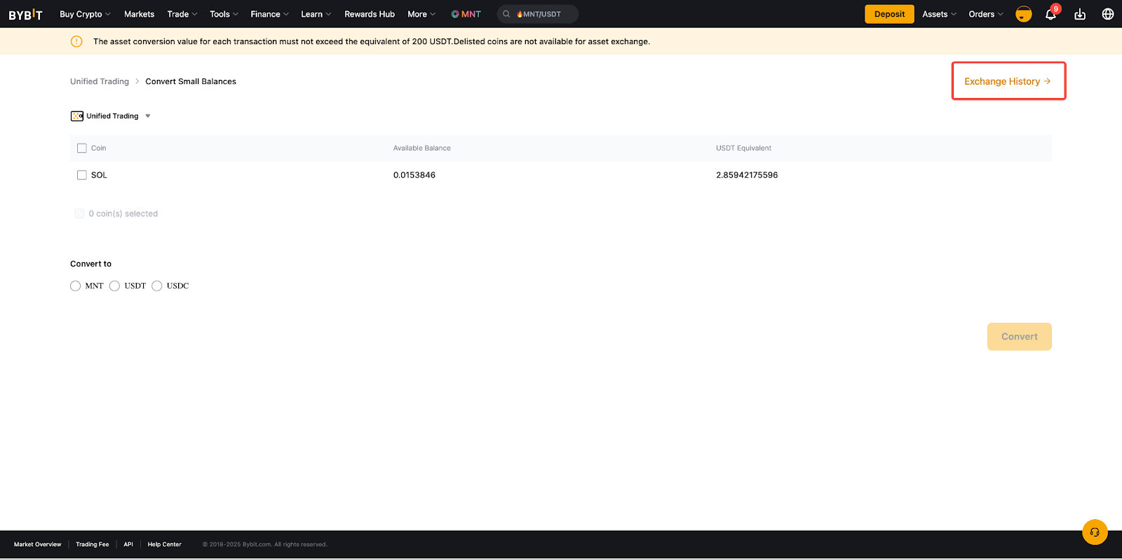 为了全面利用您的Bybit账户小额资产,您可以通过以下四个简单步骤,在一次转换中将任何价值低于0.001 BTC或等值资产转换为MNT、USDT 或 USDC。通过资金账户和统一交易账户 (UTA) 均支持兑换小额资产功能。 请注意,小额资产兑换功能限制为每 1 小时一次使用。