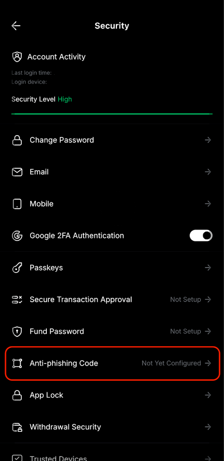 为防止网络钓鱼企图,Bybit 强烈建议通过网站或应用程序设置反网络钓鱼代码。如果您尚未设置您的反网络钓鱼代码,请转到您的帐户和安全页面,然后按照本指南进行操作。