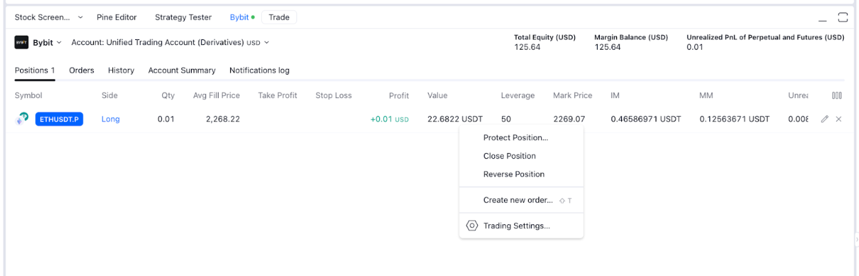 第 5 步:您已连接至 Bybit 经纪商,现在可以使用 TradingView 进行 Bybit 交易了。