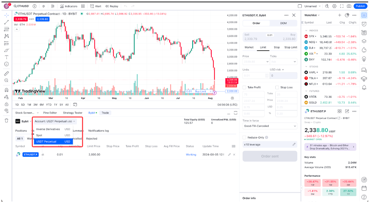 本指南将指导您使用 TradingView 在 Bybit 上进行交易。 您将了解如何将 Bybit 账户(主账户或子账户)与 TradingView 关联、下单和管理订单等。 目前,TradingView 支持在 Bybit 上进行现货、反向永续、USDT 和 USDC 永续交易。