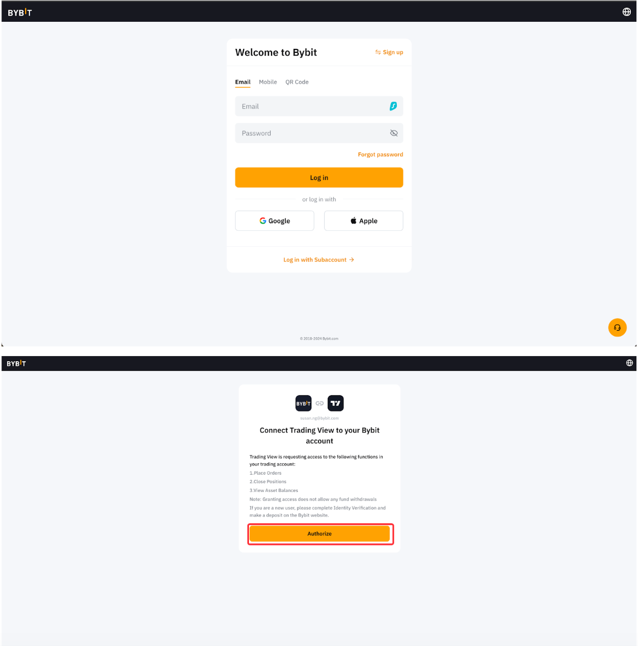 第 4 步:输入您的 Bybit 登录认证信息,然后依次点击登录和授权。