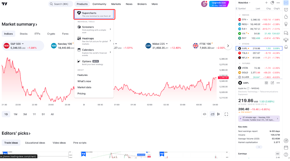 第 1 步:登录您的 TradingView 账户。然后在首页点击产品 → 超级图表。