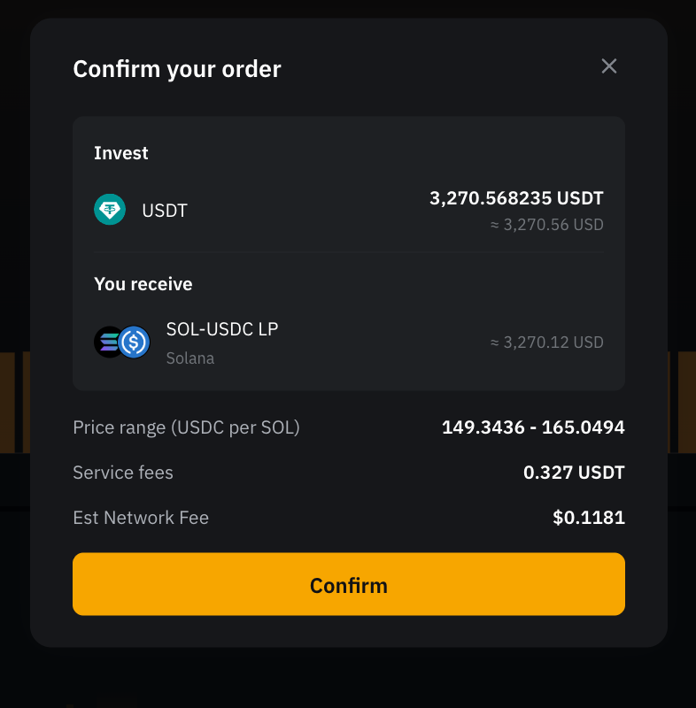 Step 4: Enter the amount of cryptocurrency you wish to invest in the selected liquidity pool, then click Invest and confirm your order.