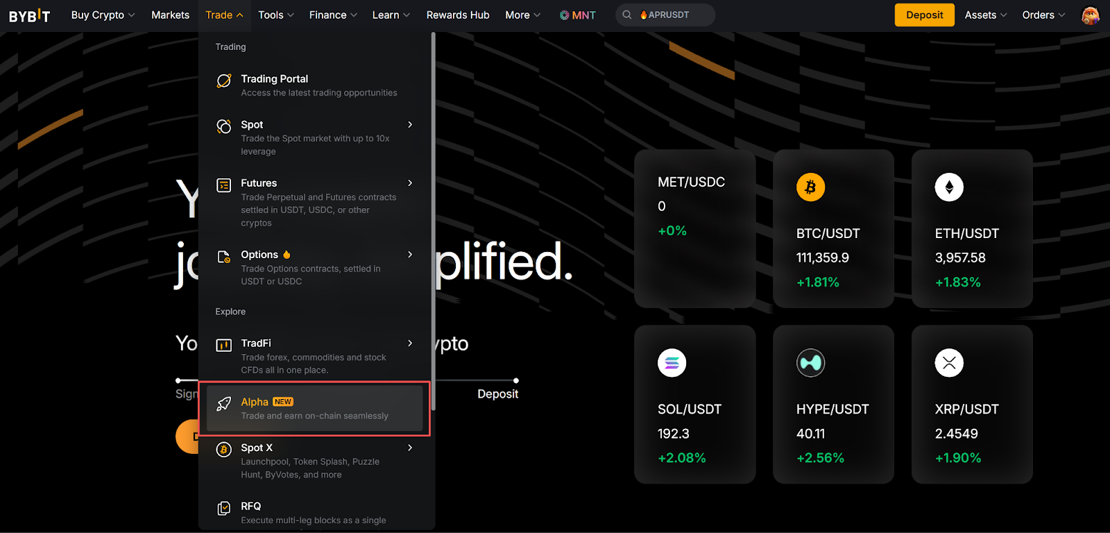 Step 1: Go to Trade in the top navigation bar and click Alpha.