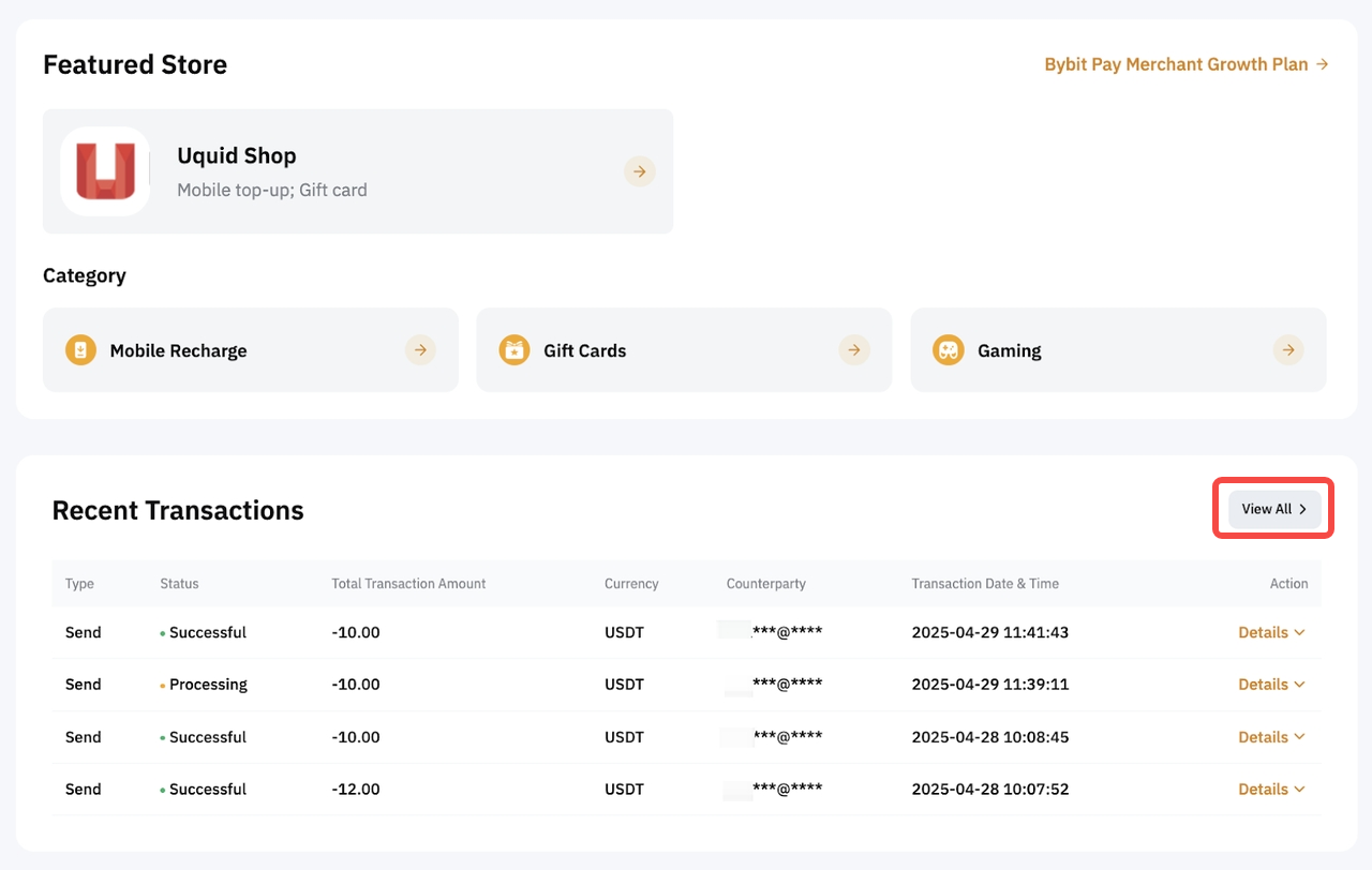 要查看您的付款历史记录,请前往“Bybit Pay”页面,滚动到底部,然后单击“查看全部”。或者,只需前往您的“付款交易记录”。