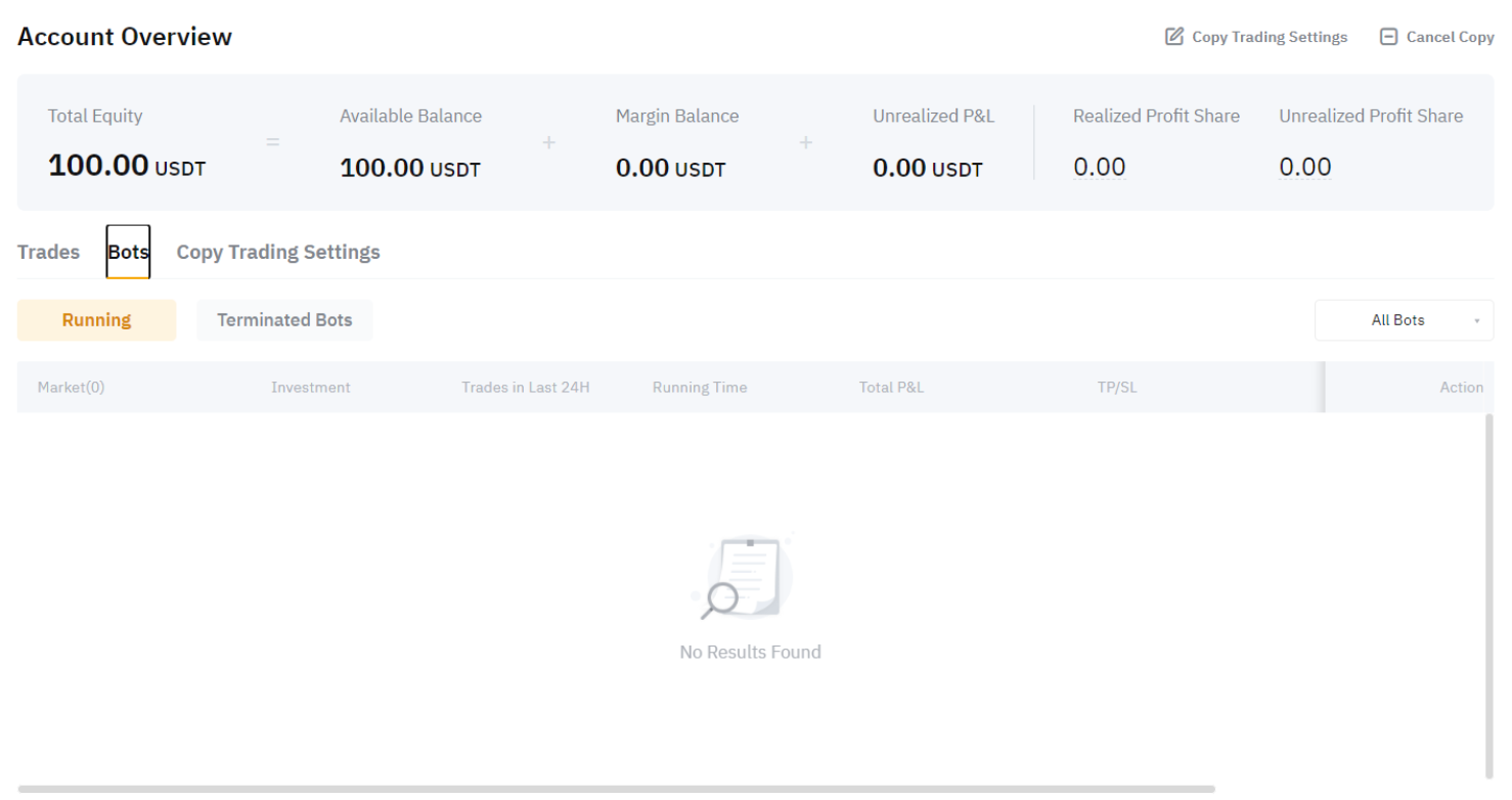 请注意,在您取消跟单交易达人后,您的机器人将被终止,所有未平仓位将被平仓,剩余的余额将退还至您的资金账户。