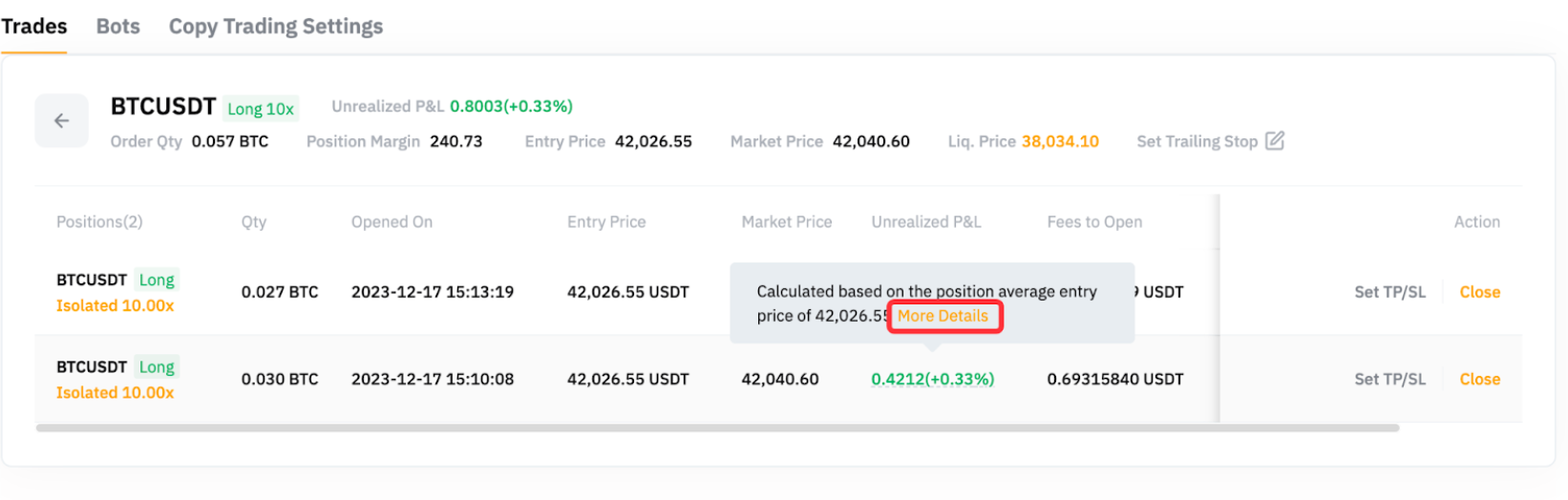 请注意,持仓详情中显示的入场价格为持仓平均入场价格。 若要查看开仓价格是如何计算,您可以将光标移至未实现盈亏并点击更多信息以查看持仓平均入场价格的变化历史记录。
