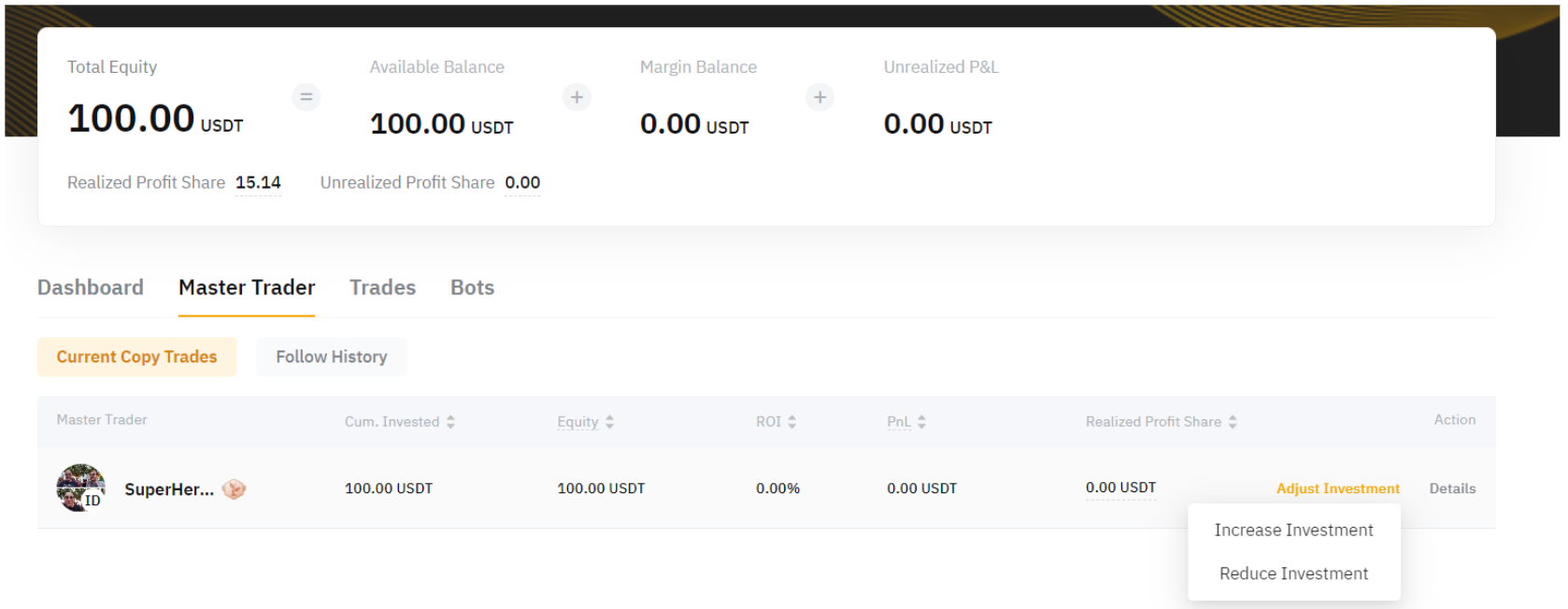 您可以查看不同交易达人的当前跟单交易和跟单历史记录。 您也可以点击调整投资来增加或减少您的资金对相应交易达人进行跟单的本金调整。 请注意,减少的金额将自动转入您的资金账户。