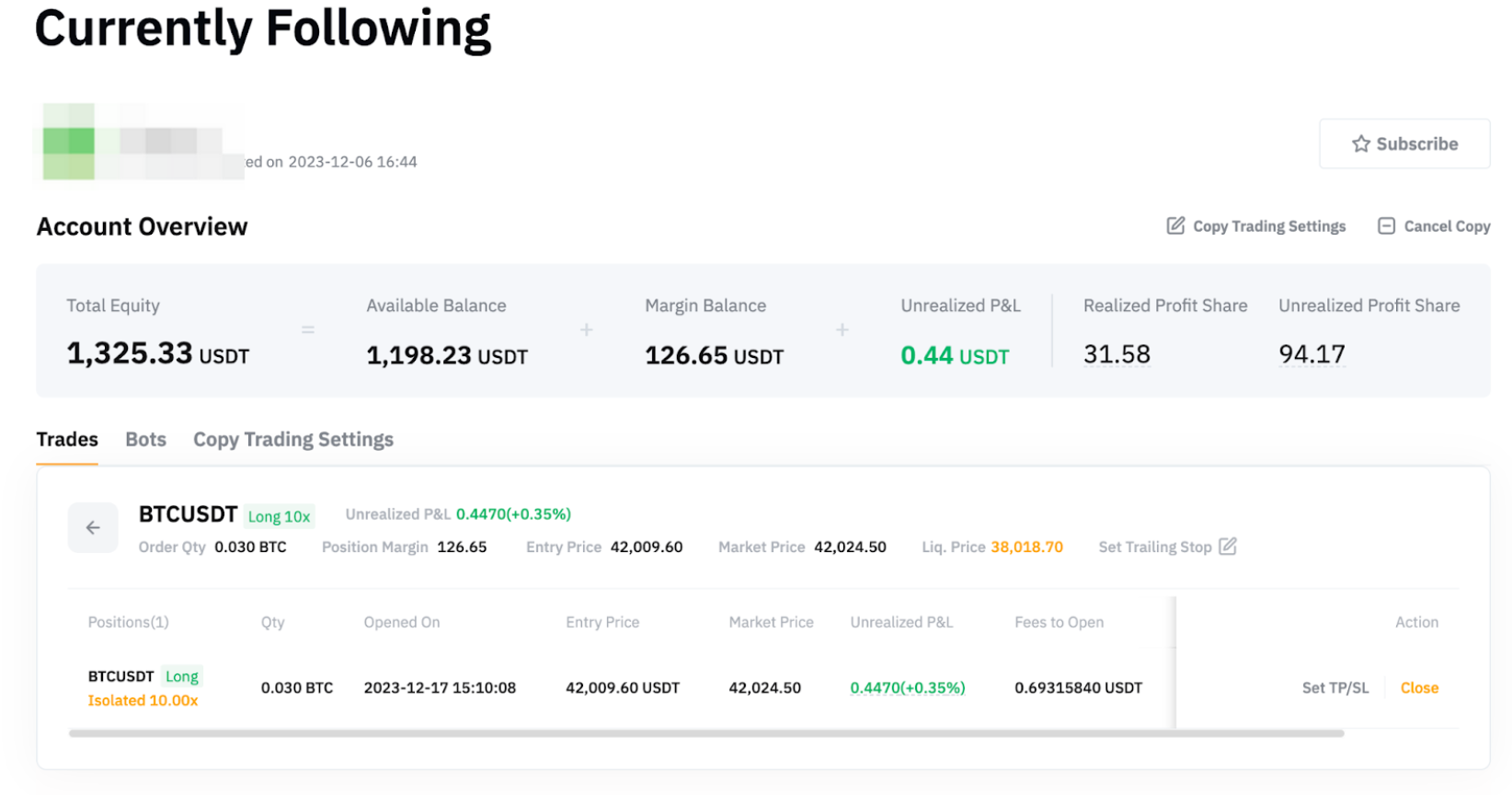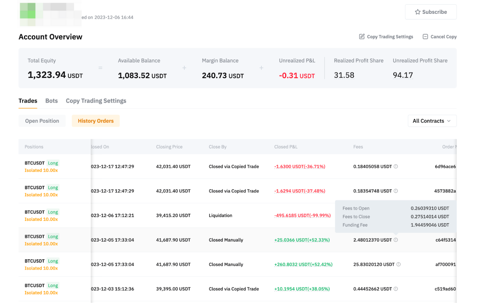 盈亏 = 仓位已结盈亏 + 未结盈亏(对该交易达人进行跟单期间) 这包括跟单的 USDT 永续交易中的仓位或复制的合约网格交易机器人内的仓位。 |