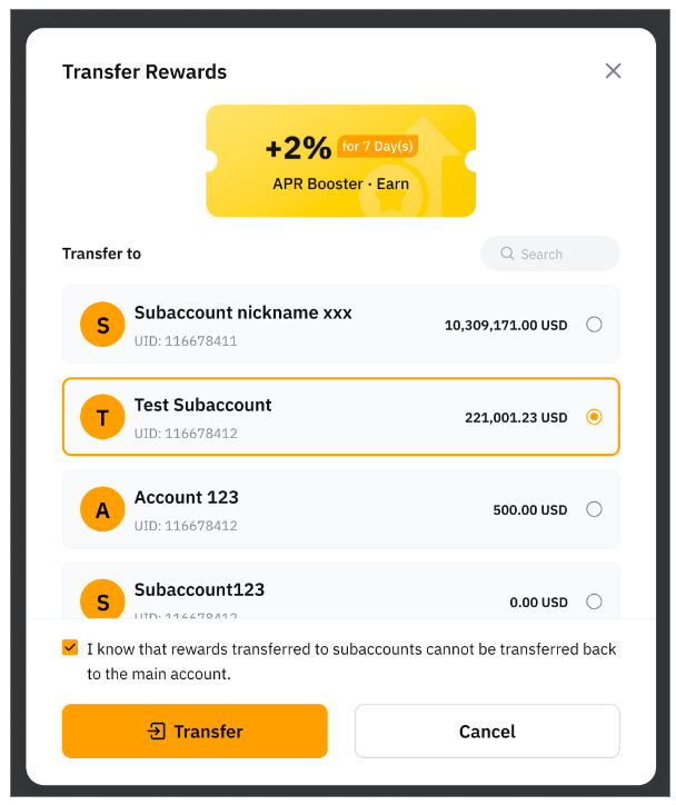 — 奖励划转至子账户后,无法划转至主账户或其他子账户。确认转账前,请务必选择正确的奖励和子账户。