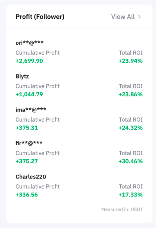 一旦跟单用户对交易达人进行跟单,其收益将实时显示在这一部分。累计跟单收益额和跟单总收益率将于每日 00:00 (UTC) 更新。