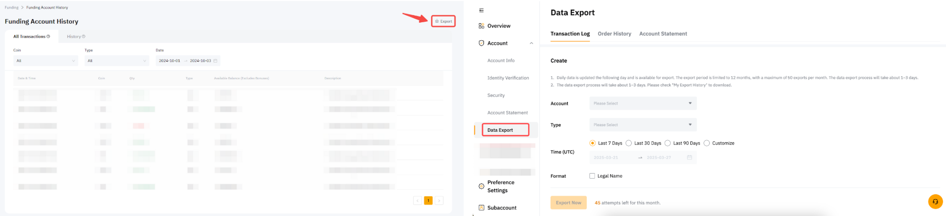 第 1 步:请点击资产 → 资金账户 → 历史记录 → 导出或前往数据导出页面。