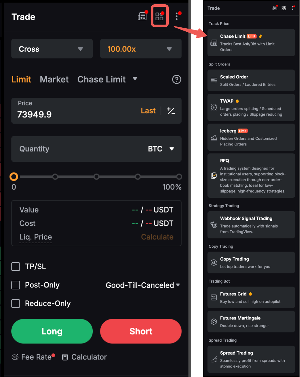 追踪价格并拆分订单 | 使用我们的高级订单类型来增强您的交易策略。选择您心仪的订单后,下单区将自动更新,以便您填写必要的订单详情。 如果您对何时以及如何使用 Bybit 提供的各种订单类型有任何疑问,请参阅此指南。 |