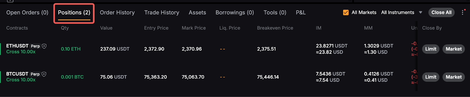未结盈亏 (%) | 未结盈亏显示持仓的实时未实现盈亏。 默认情况下,仓位标签上的未结盈亏是根据最新成交价计算的,不包含任何资金费或交易手续费。 然而,当您将鼠标移至未结盈亏时,它将显示基于标记价格的计算,以便交易者能更好地估算亏损以防止强制平仓。 尽管如此,交易者平仓后的实际结算将使用基于最新成交价计算的未结盈亏。 括号中显示的是仓位的投资回报率(ROI),以百分比形式表示(未结盈亏 %)。与未结盈亏类似,该数值会根据最新成交价或标记价格的变动而变化 阅读更多: |