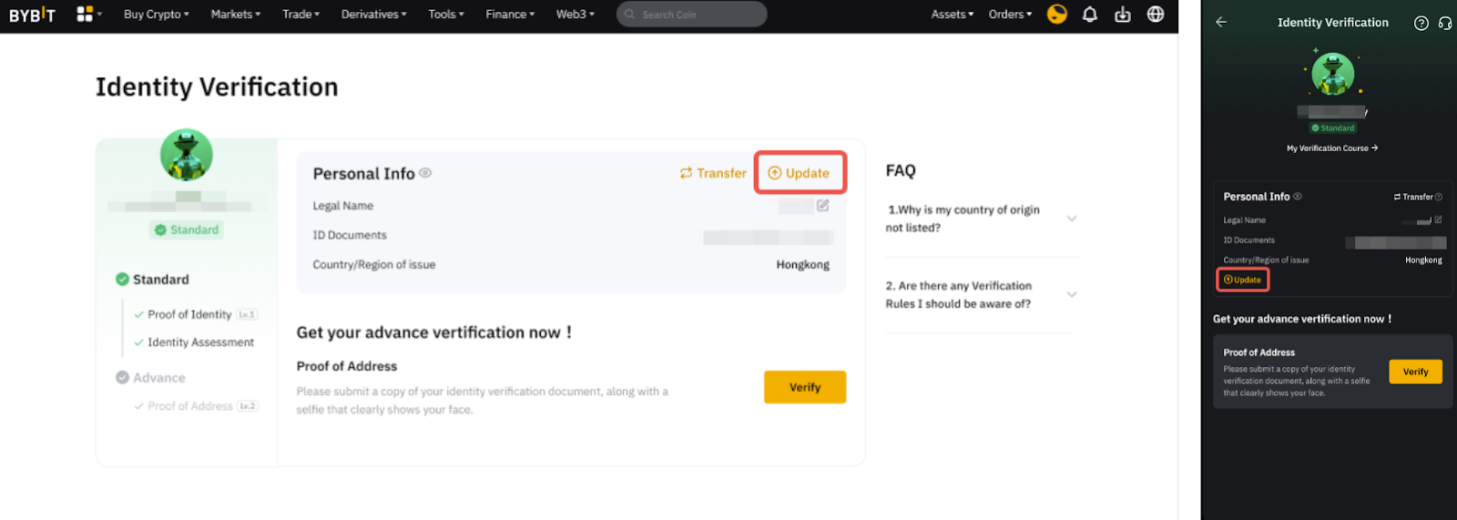 所有 Bybit 产品和服务都必须进行至少标准等级的身份验证。根据不同地区、产品或服务的要求,您可能需要完成更高级别的验证。欲了解更多关于不同 KYC 级别的优势,请参阅此处。
