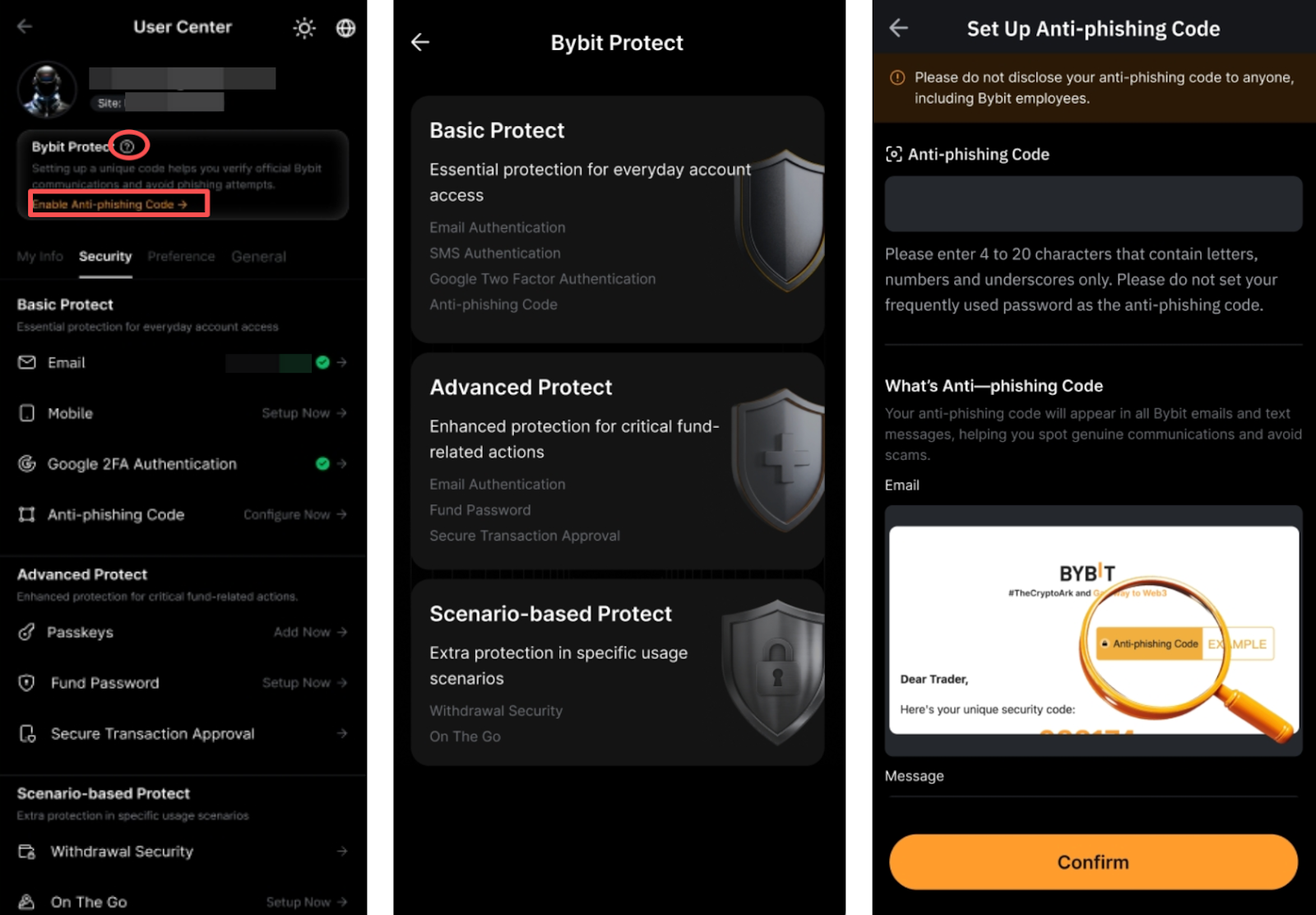 - 请务必检查 Bybit 电子邮件或短信中的反钓鱼码,以确保消息真实有效。