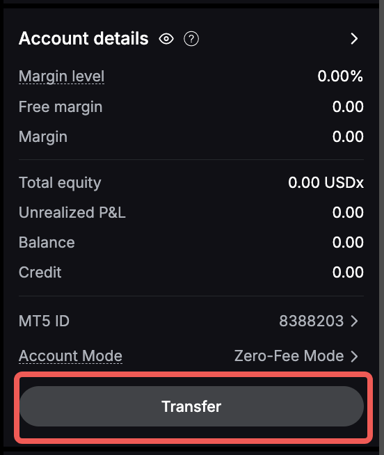 - 如果您未能满足存款要求,请点击“账户详情”下的“转账”按钮,并执行必要的转账至您的 TradFi 账户。