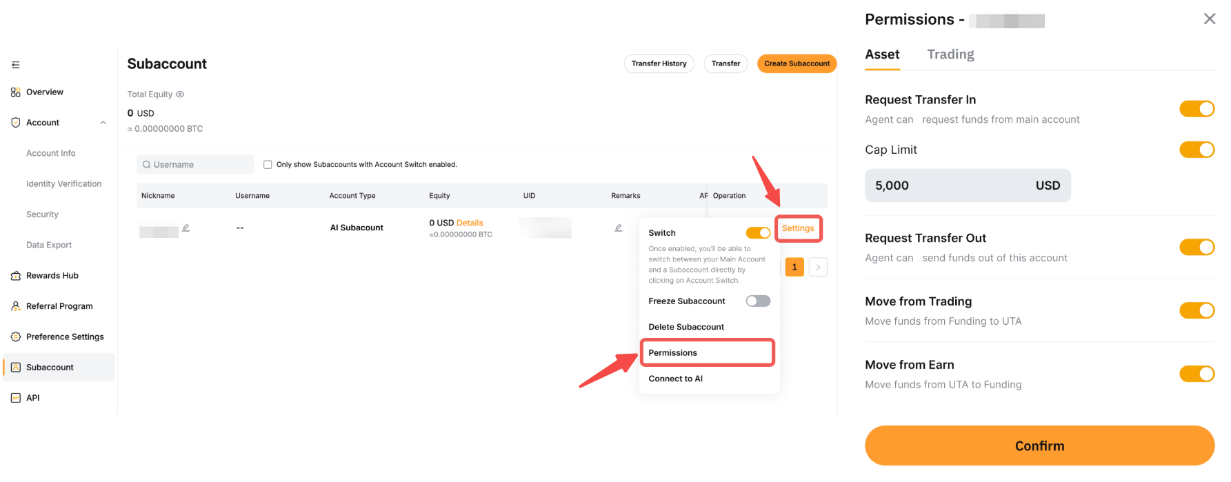 前往子账户管理页面,找到您的 AI 子账户并点击设置 → 权限,以管理您的 AI 子账户权限。
