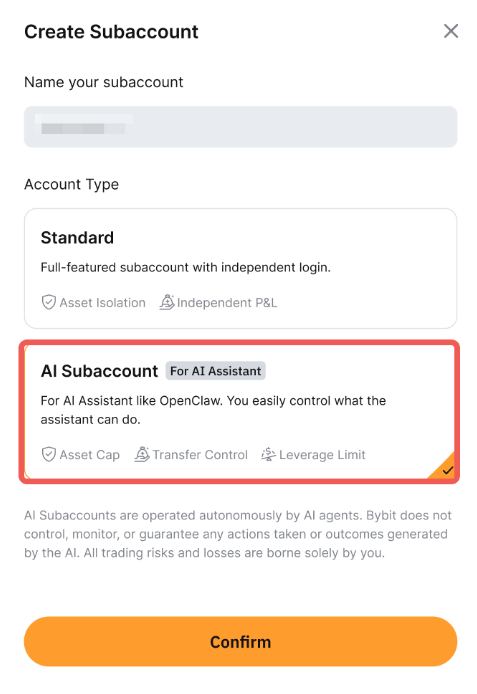 步骤 2: 输入子账户名称并选择 AI 子账户,然后点击 确认.