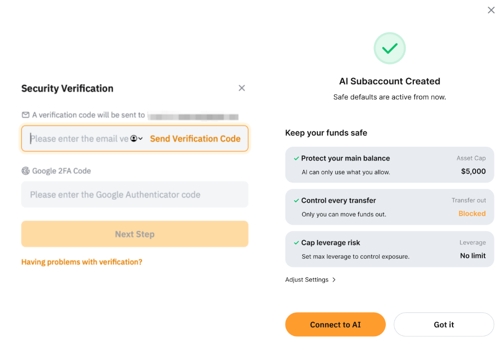在设置好您的 AI 子账户后,您可以管理其权限。为了保护您的账户和 API 访问安全,请切换至您的主账户来配置这些设置。