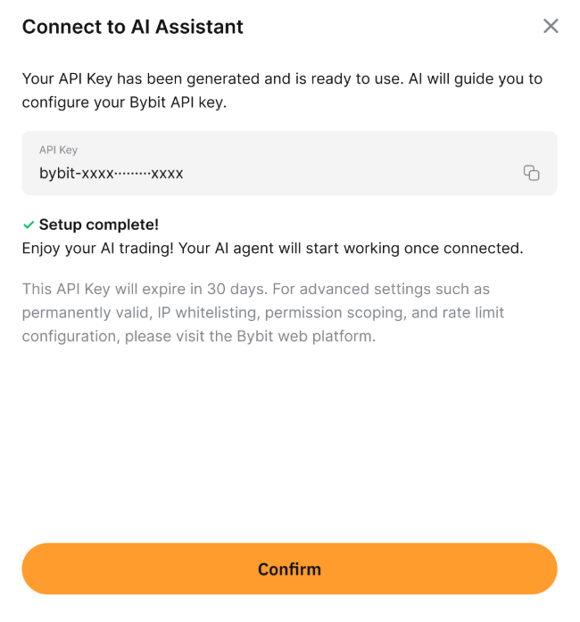 设置已完成!您的API密钥已生成,可供使用。请按照您的人工智能助手指南来配置您的 Bybit API 密钥。