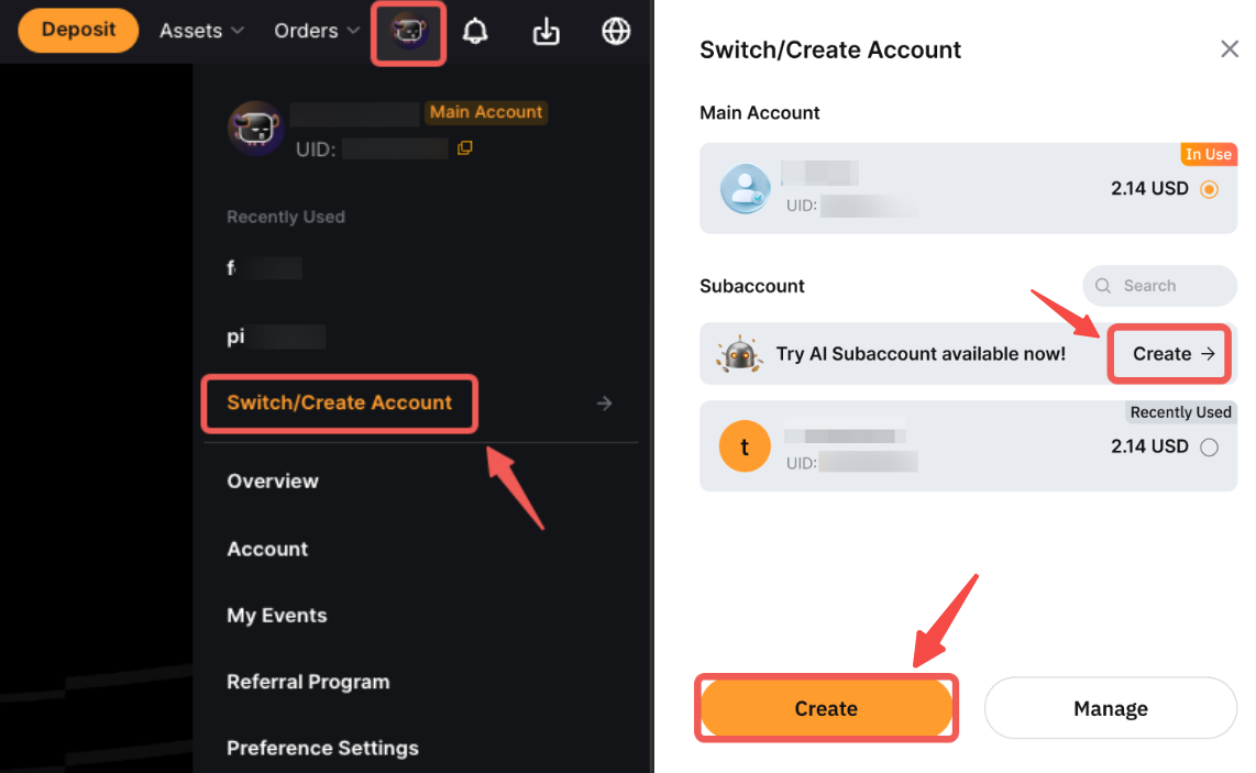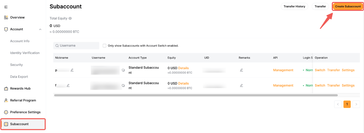 第 1 步: 前往 子账户页面 并点击 创建子账户 以创建一个新的 AI 子账户。