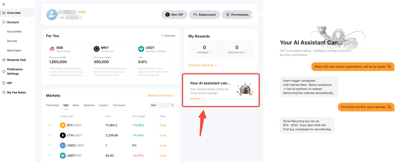 您已准备就绪!点击“您的AI助手可以……”以查看您可与AI助手一同使用的交易指令范例。