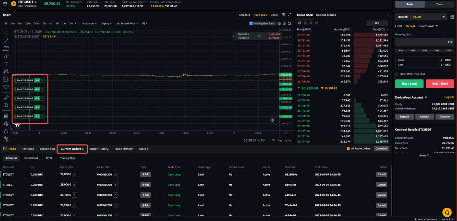 成功提交分段订单后,系统将更新您的图表,体现各个价格的分段订单的状态。您可以从“当前订单”选项卡中查看已经提交的限价单。