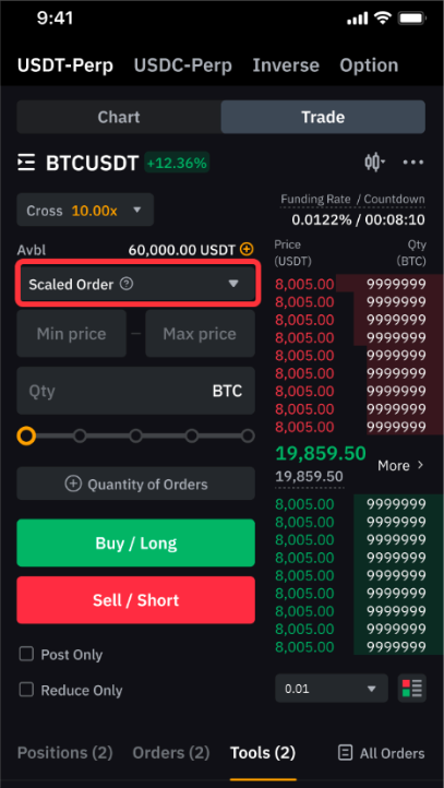 例如,BTCUSDT 的最小和最大订单规模分别为 0.001 BTC 和 100 BTC。因此,分段订单的最小和最大数量则分别为 0.01 BTC 和 1000 BTC。