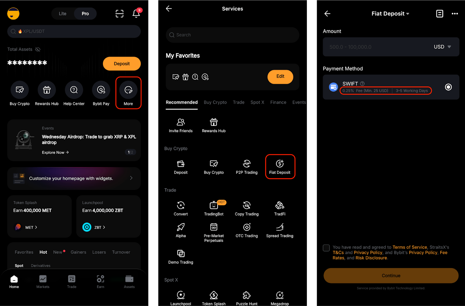 在应用程序上,请转到主页并点击更多,然后选择法币充值。接下来,点击法定货币以查看每种可用付款方式的相关费用。