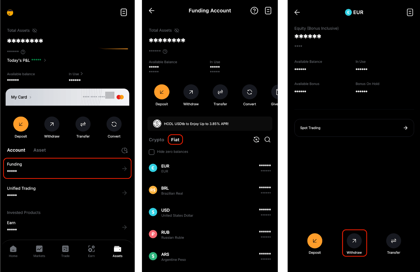 在应用程序上,请转到资产页面,然后点击资金 → 法币。然后,点击法币货币,并参考每种付款方式的相关费用。
