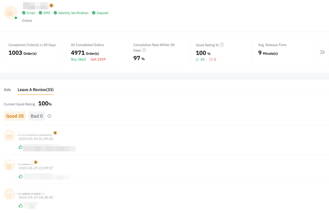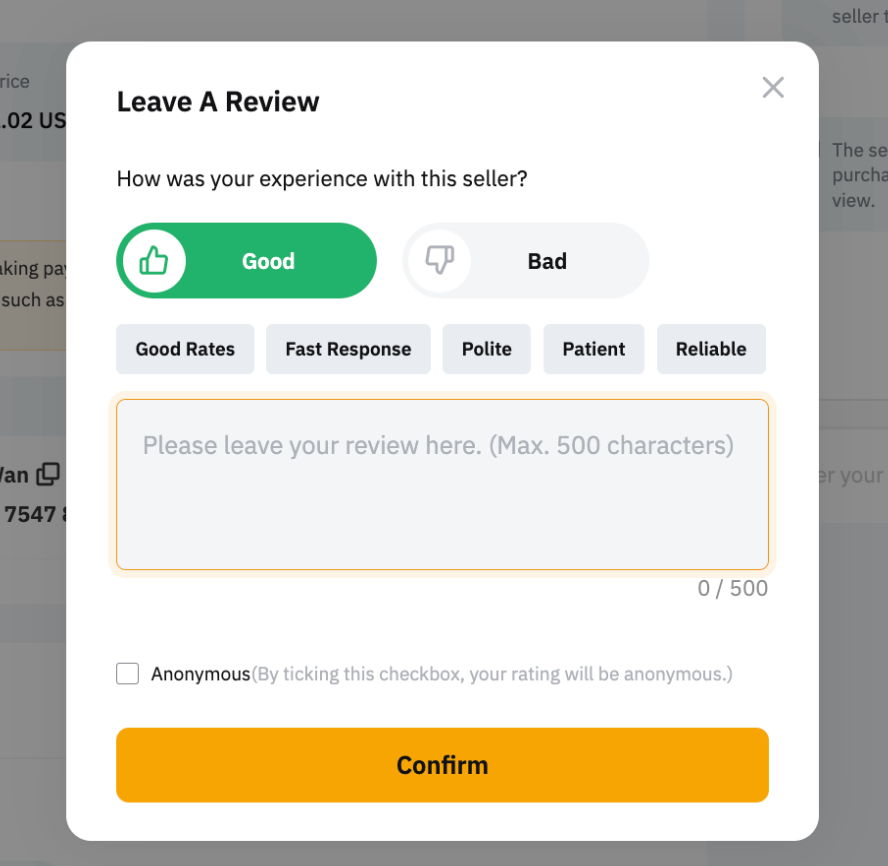 请注意,您和其他用户在交易对手的 P2P 个人资料页面上留下的评论对所有 P2P 交易者可见。因此,您的评论至关重要,在选择 P2P 广告时会影响其他用户的决策。我们鼓励所有用户留下诚实和建设性的反馈,帮助平台所有 P2P 交易者提升交易体验。