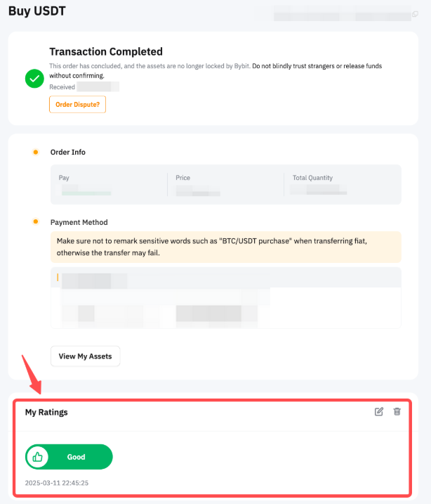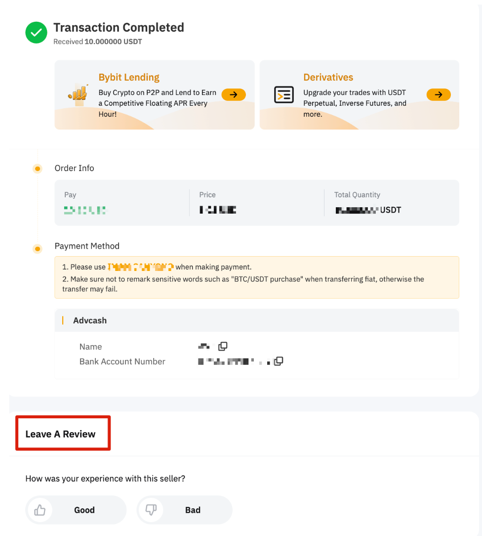 第 2 步:除了给您的交易体验打分,Bybit P2P 评论功能还可以让您对您的交易对象进行评论。