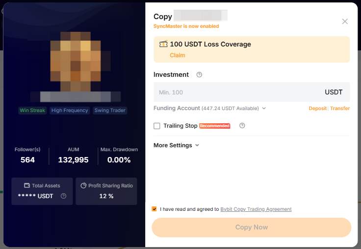 投資額 | 這是您複製該交易達人所需投資的總金額。 您可以根據您的Bybit帳戶餘額輸入金額,也可以選擇使用哪個帳戶餘額,例如合約帳戶、資金帳戶等。 一般情況下,跟單最低金額為100 USDT。 然而,交易達人可能會建議或強制他的跟單用戶同步複製他所需的最低資金。 |