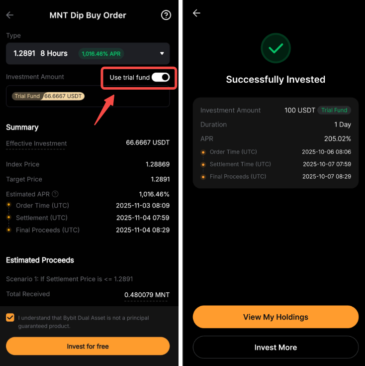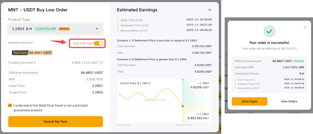 雙幣投資試用基金可讓您體驗實際的雙幣投資報酬率,而不會應用任何成本。您的收益取決於產品的結算價格和年利率。雖然收益率會加至您的帳戶,但試用基金本金不會計入您的總資產。