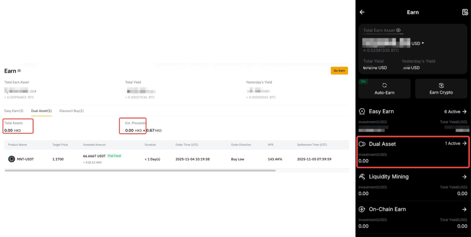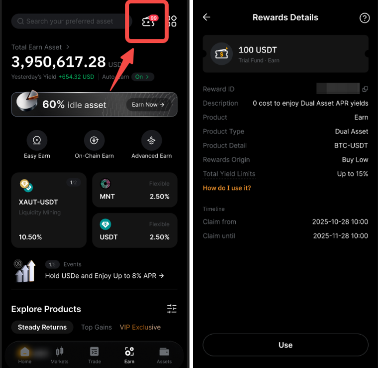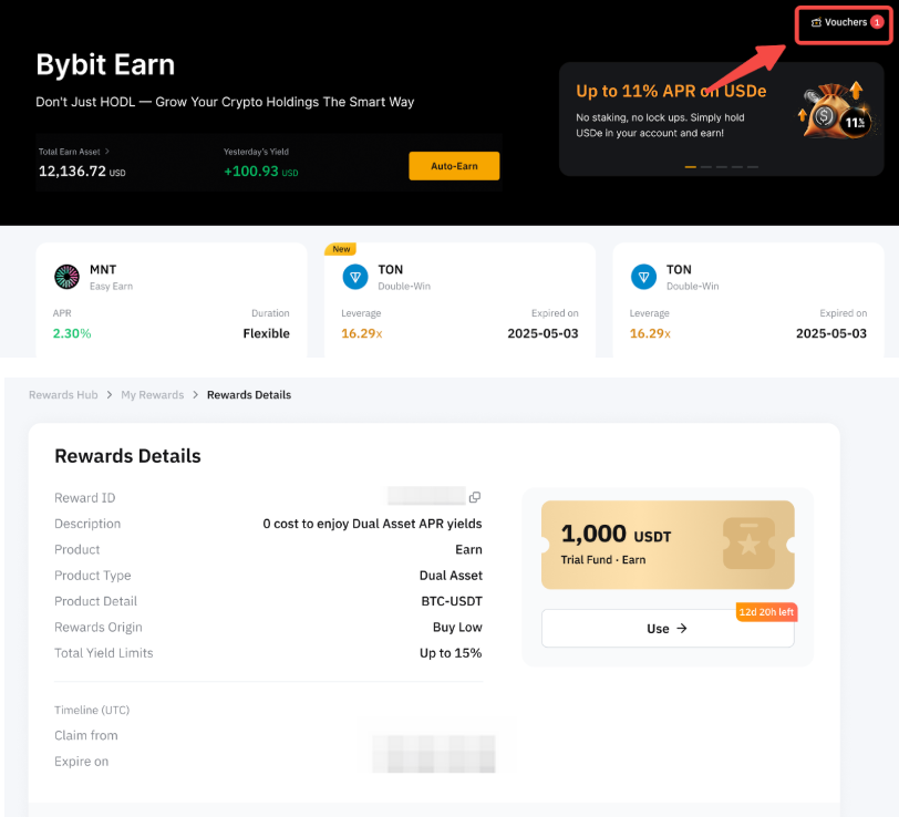 如果您有資格獲得雙幣投資產品的試用基金,您可以在理財商城頁面右上角的 Voucher 找到獎勵。或者,您也可以在我的獎勵頁面找到這些試用基金獎勵。