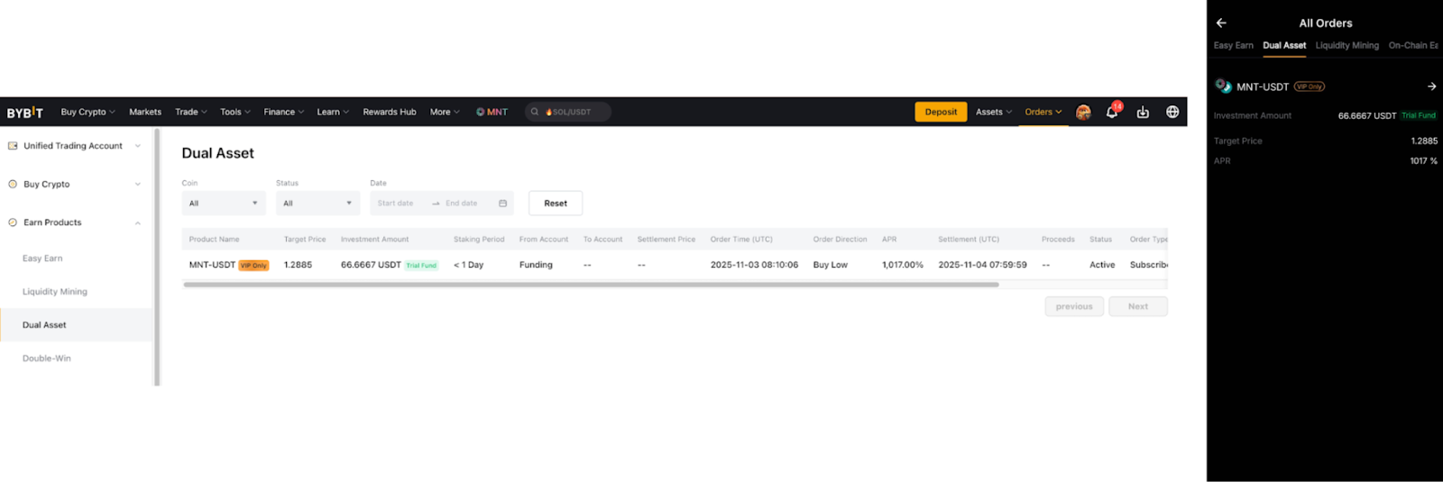 下單後,您可以按一下查看訂單,在雙幣投資產訂單歷史記錄頁面找到成功訂單。