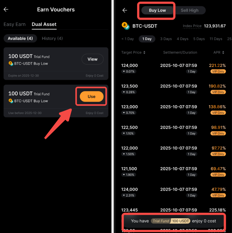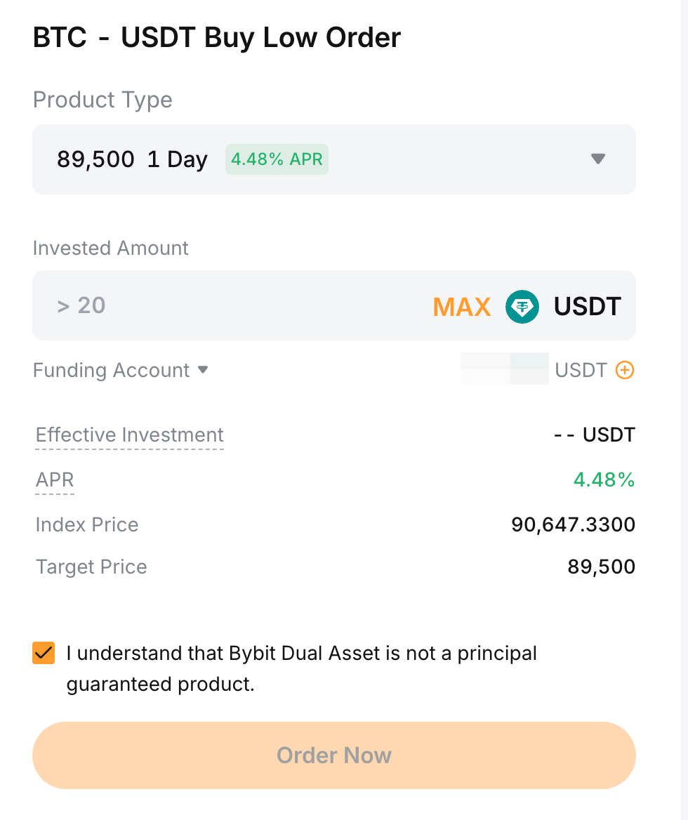 對於「低買」產品,您可以使用穩定幣 (USDT) 進行申購;而對於「高賣」產品,您可以使用加密貨幣資產(例如 BTC、ETH)進行申購。