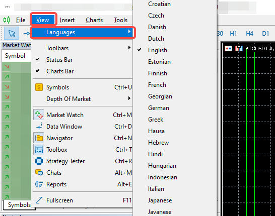 若要變更 MT5 用户終端上的語言顯示,只需點選檢視選單 → 語言 ,然後在可用清單中選擇語言。